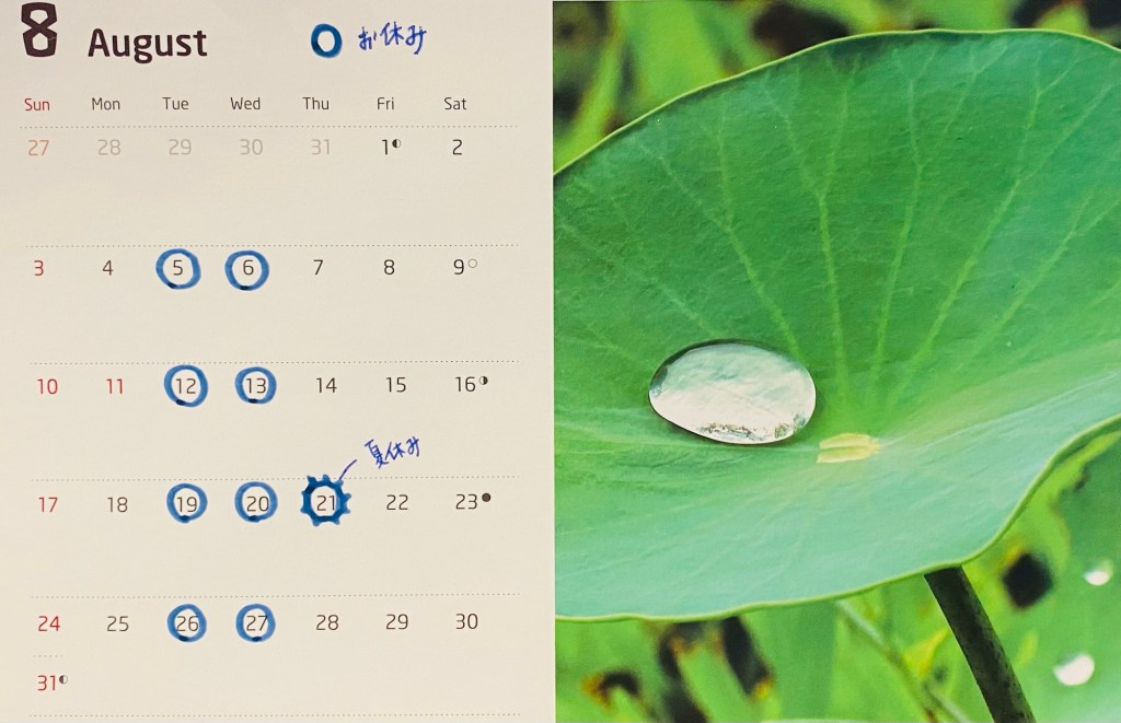 8月は定休日(火・水)以外に、追加で1日お休みします。よろしくお願いいたします。