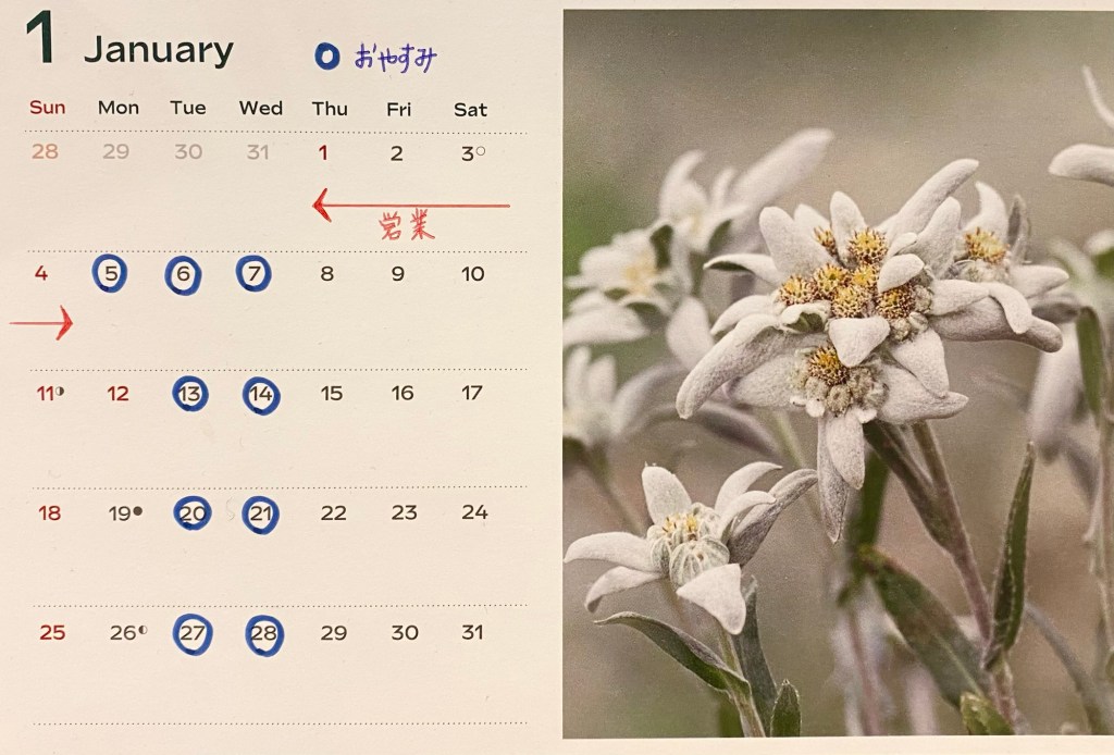 1日〜6日は営業し、代わりに8日(木)をお休みにさせていただきます。