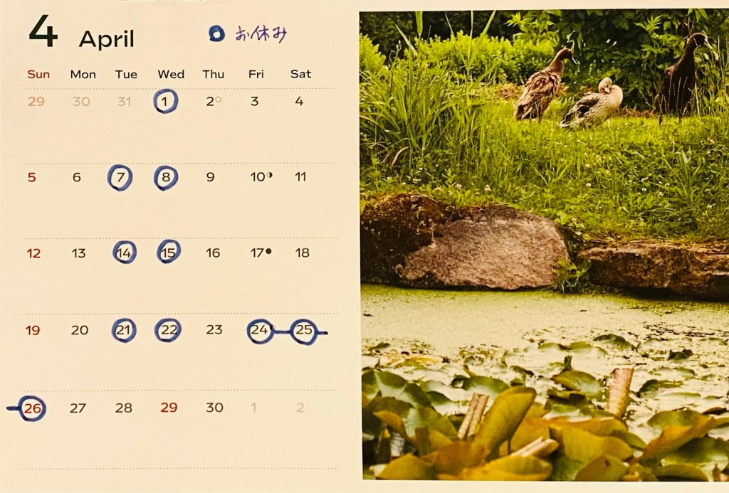 4月は営業日がいつもと違います。わかりづらくて申し訳ありませんが、よろしくお願い致します。